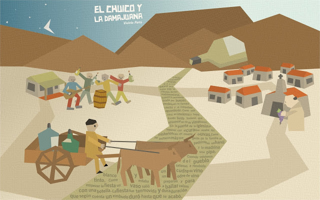 Este trabajo consistió en interpretar gráficamente la letra de la canción. La canción a representar fue El chuico y la damajuana, de Violeta Parra (Chile). En esta pieza gráfica se pueden observar tres momentos: el viaje en carreta hacia la iglesia, el pueblo y la fiesta.