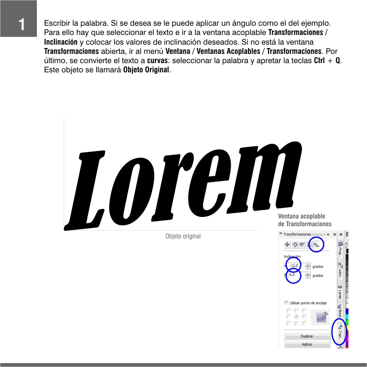 Escribir la palabra. Si se desea se le puede aplicar un ángulo como el del ejemplo. Para ello hay que seleccionar el texto e ir a la ventana acoplable Transformaciones / Inclinación y colocar los valores de inclinación deseados. Si no está la ventana Transformaciones abierta, ir al menú Ventana / Ventanas Acoplables / Transformaciones. Por último, se convierte el texto a curvas: seleccionar la palabra y apretar la teclas Ctrl + Q. Este objeto se llamará Objeto Original.