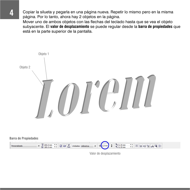Copiar la silueta y pegarla en una página nueva. Repetir lo mismo pero en la misma página. Por lo tanto, ahora hay 2 objetos en la página. Mover uno de ambos objetos con las flechas del teclado hasta que se vea el objeto subyacente. El valor de desplazamiento se puede regular desde la barra de propiedades que está en la parte superior de la pantalla.