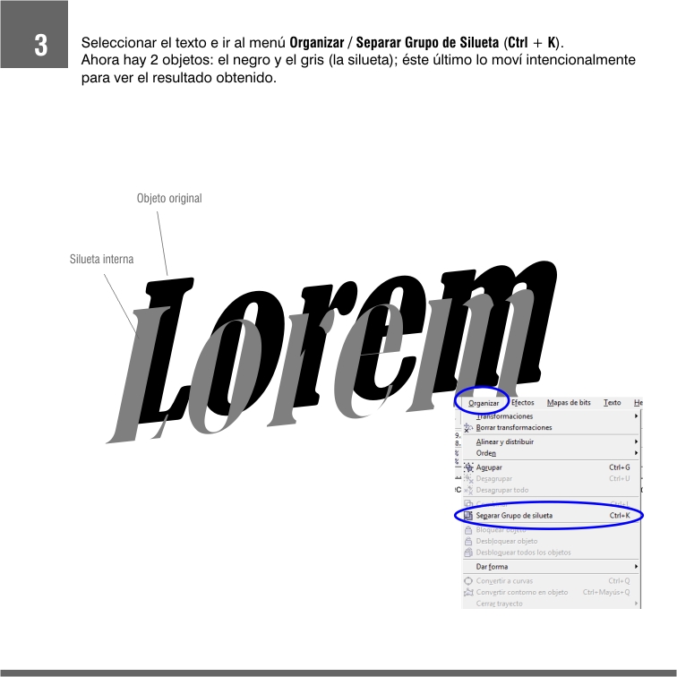 Seleccionar el texto e ir al menú Organizar / Separar Grupo de Silueta (Ctrl + K).Ahora hay 2 objetos: el negro y el gris (la silueta); éste último lo moví intencionalmente para ver el resultado obtenido.