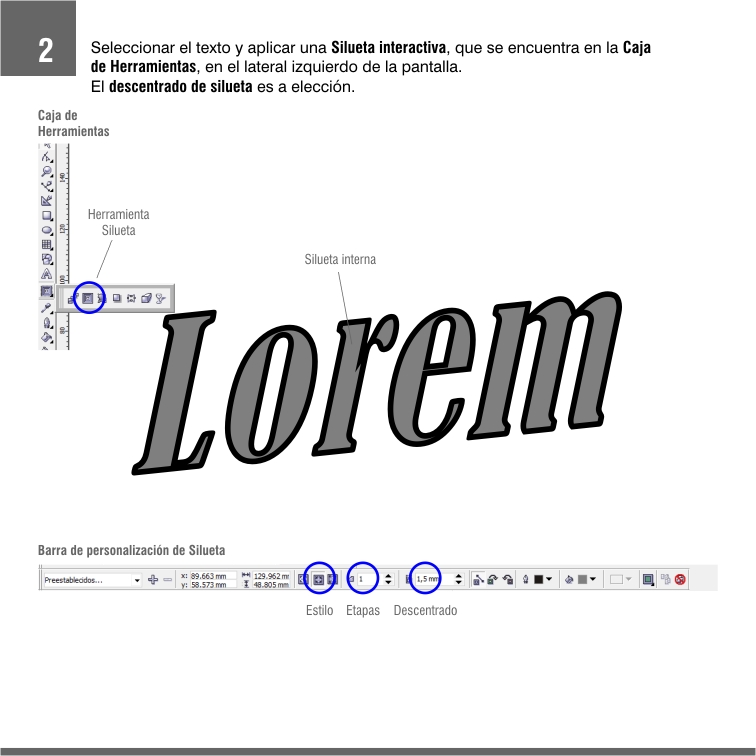 Seleccionar el texto y aplicar una Silueta interactiva, que se encuentra en la Caja de Herramientas, en el lateral izquierdo de la pantalla. El descentrado de silueta es a elección.