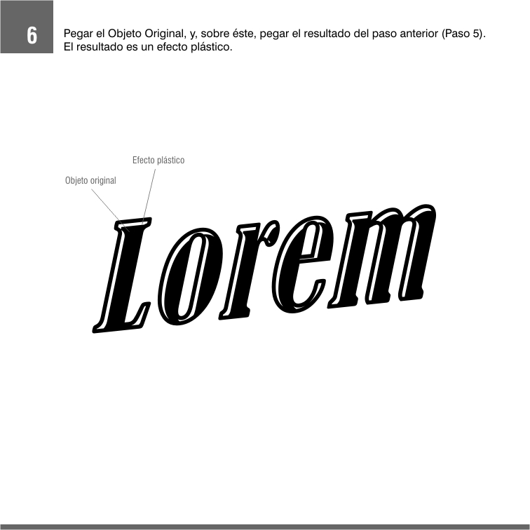 Pegar el Objeto Original, y, sobre éste, pegar el resultado del paso anterior (Paso 5). El resultado es un efecto plástico.
