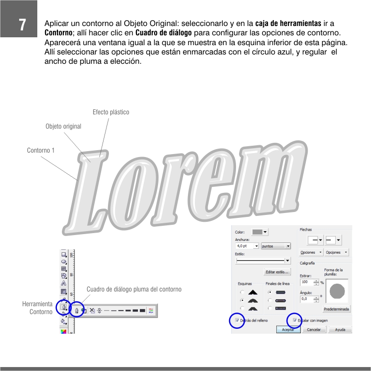 Aplicar un contorno al Objeto Original: seleccionarlo y en la caja de herramientas ir a Contorno; allí hacer clic en Cuadro de diálogo para configurar las opciones de contorno. Aparecerá una ventana igual a la que se muestra en la esquina inferior de esta página. Allí seleccionar las opciones que están enmarcadas con el círculo azul, y regular el ancho de pluma a elección.
