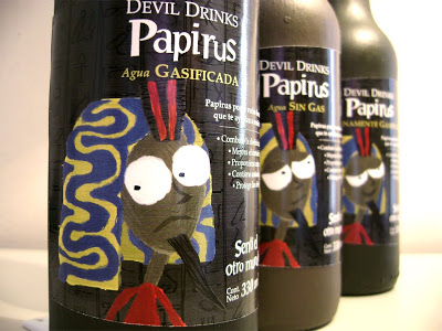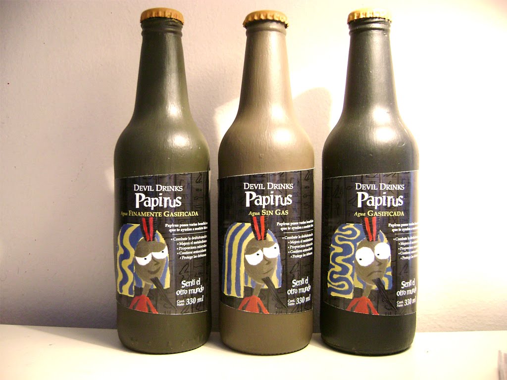 Todas las botellas fueron pintadas por mí, con acrílico. Las tuve que pintar varias veces hasta conseguir el color deseado. Las de agua eran en su origen un color tipo beige.
