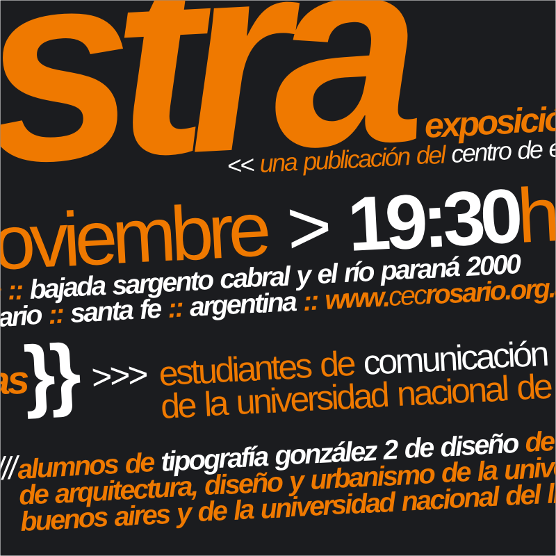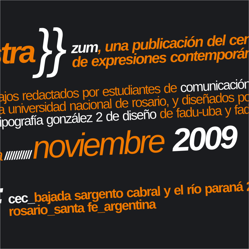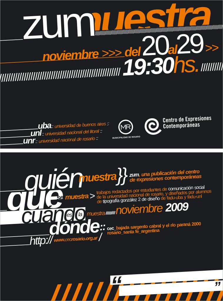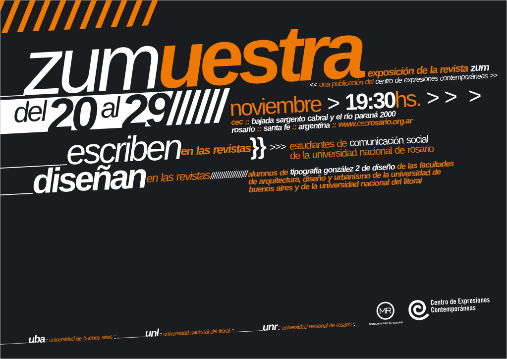 Sistema para la muestra de la revista ZUM de Rosario (Santa Fe) realizada por estudiantes: la diseñaron estudiantes de diseño gráfico de las universidades de Buenos Aires (FADU-UBA) y Del Litoral (FADU-UNL); y escribieron alumnos de comunicación social de la univ. de Rosario (UNR).