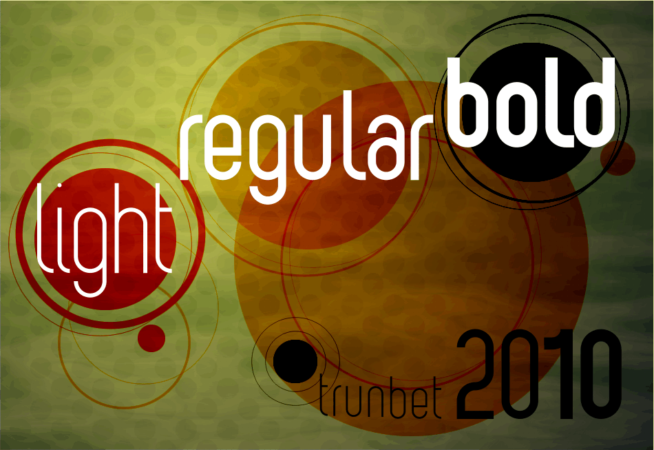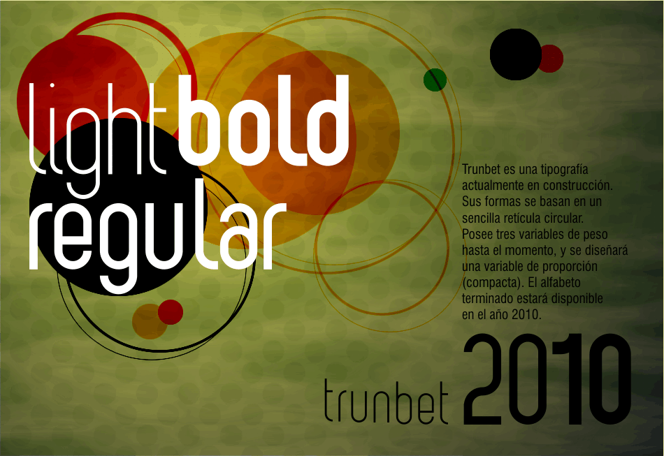 Trunbet es una tipografía que actualmente estoy construyendo. Sus formas se basan en un sencilla retícula circular. Posee tres variables de peso hasta el momento (light, regular/medium, bold), y se diseñará una variable de proporción (compacta / expandida). El alfabeto terminado estará disponible en el 2010.