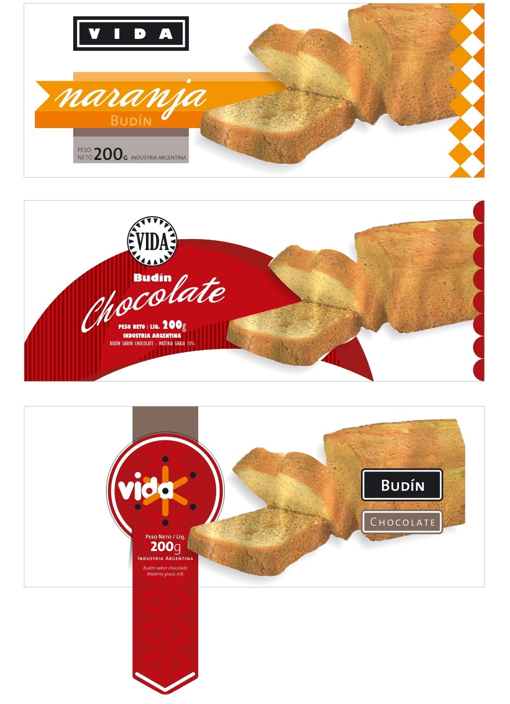 Estos son dos bocetos para el desarrollo de un sistema de packaging del rubro panificación, para una marca blanca, en este caso se llama Vida. Hay que hacer dos sistemas independiente (dos propuestas) y uno será el elegido. Los packs a realizar son: budines, grisines, pan lactal y pan para ha