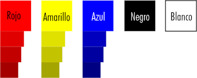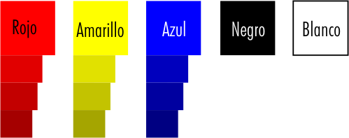 Usé principalmente los tres colores primarios (rojo, amarillo y azul); el negro y el blanco en menor proporción. Para cada uno de los tres colores primarios hice 3 tonos más oscuros.