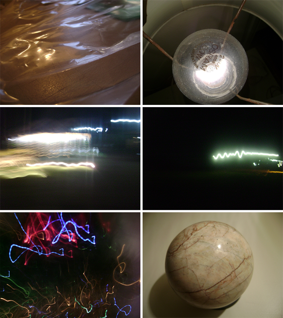 Fotos (de izq. a der.): la primera es una foto de un plástico transparente; la que sigue son luces de la calle moviendo la cámara; las otras dos son un foco; y la última una foto de una piedra.