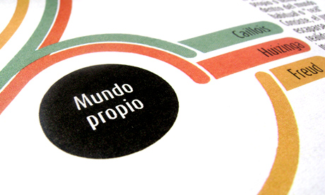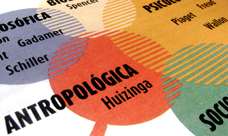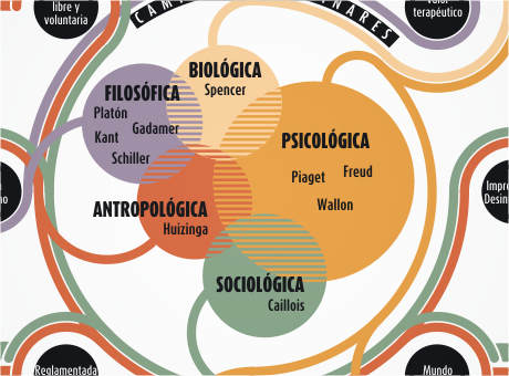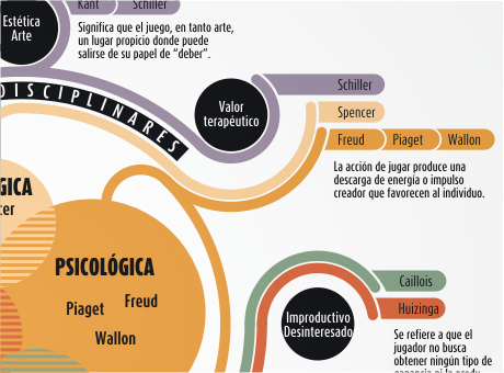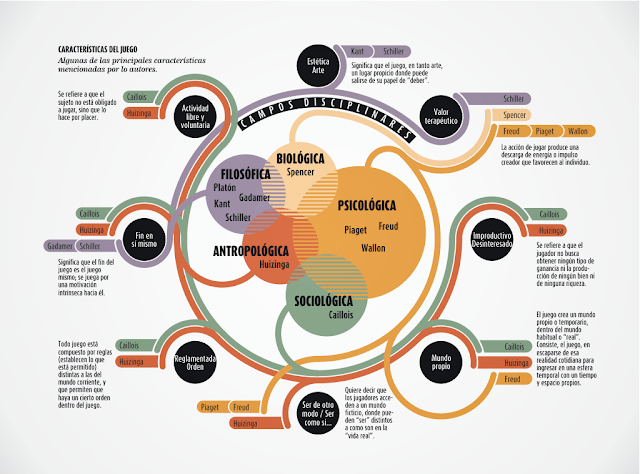 Infografía acerca del juego. Cada círculo negro representa una de las características del juego, según los autores nombrados en los cinco círculos del interior. Puedes hacer zoom en la imagen que sigue aquí abajo.