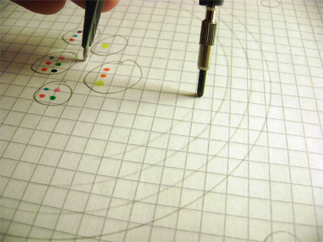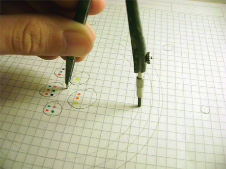 Creación de los recorridos (trazos gruesos): una vez establecido la cantidad de carriles, se pasa a unir cada círculo central (los grandes) con los círculos pequeños, respetando los colores de cada uno (celeste con celeste, rojo con rojo, etc.).