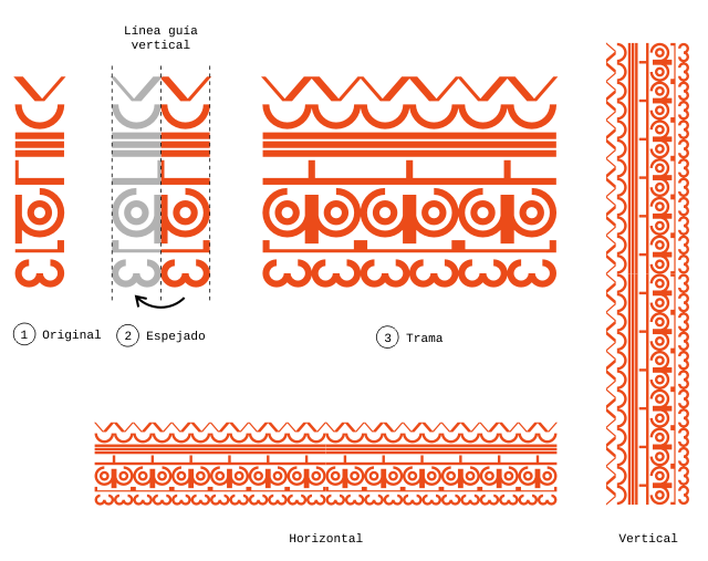 Con el logotipo se realiza una trama o banda. El proceso de creación comienza con el logo vertical (1), el cual se va duplicando y reflejando verticalmente (2) hasta formar la trama (3). El producto de este proceso se puede usar vertical u horizontalmente.