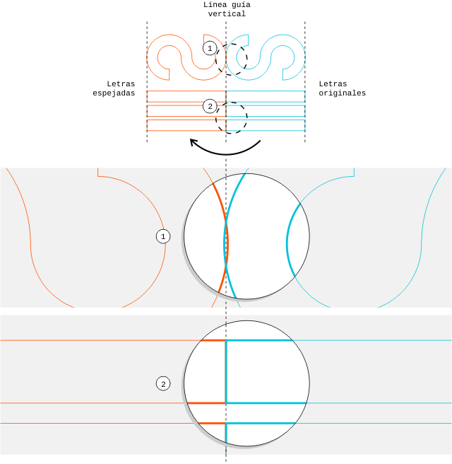 En el gráfico precedente se muestra cómo ha de realizarse correctamente la unión entre ambas palabras, entre la original y la espejada. El anclaje debe hacerse con las letras con terminaciones rectas (que son las que tienen menor largo de horizontal), ya que de hacerse con caracteres con otro tipo de terminación (curva o en punta, que son más anchos) se crearía un pequeño hueco o espacio entre las letras con acabados rectos verticales.