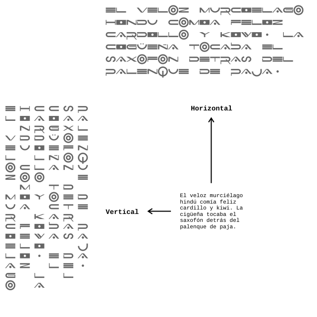 El objetivo era entonces construir y diseñar una fuente tipográfica para componer textos en sentido vertical —principalmente— y horizontal.