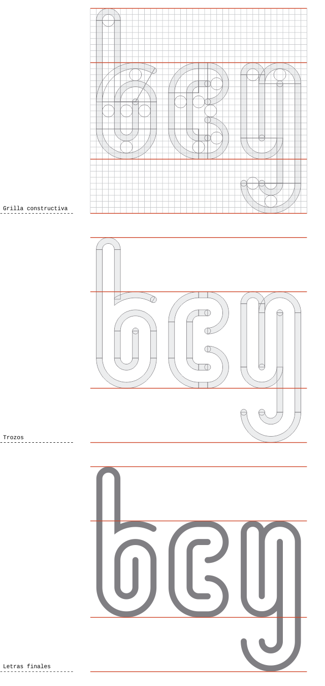 Los caracteres son construidos de fragmentos de círculos y de líneas, e insertos en una grilla. Los ascendentes y descendentes son largos y de igual proporción hacia arriba que hacia abajo, quedando en la franja central la altura x. La altura total de la grilla conforma el cuerpo tipográfico.