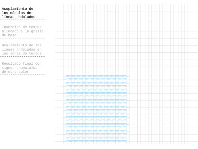 Existen estructuras modulares (aquellas compuestas por varias líneas onduladas) que permiten que se acoplan a otras, sea en sentido vertical u horizontal, de acuerdo a las dimensiones del soporte. Como resultado de esta sistematización del uso de la grilla, se pueden logran piezas que llegan a incorporar varios párrafos de textos.