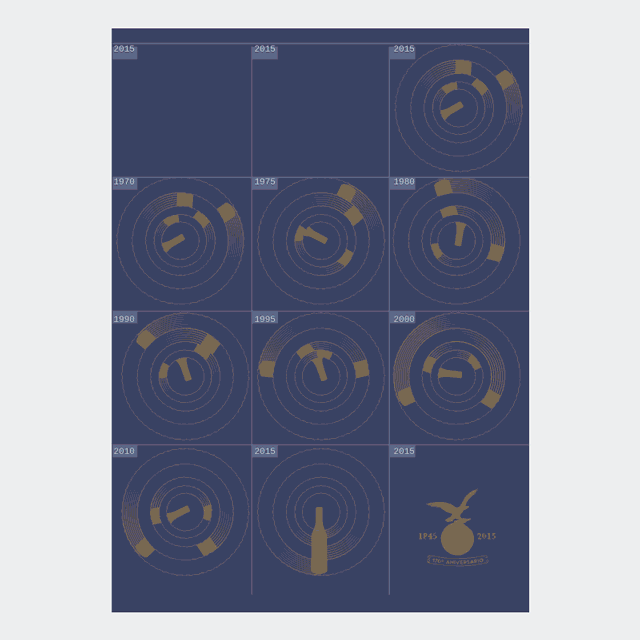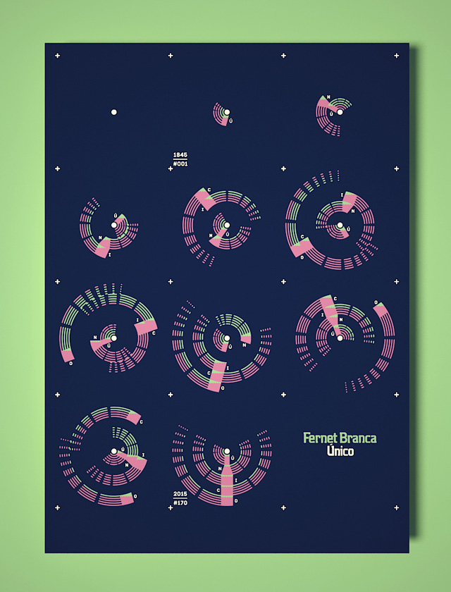 Estos movimientos se narran (nivel narrativo) por medio un diagrama que abarca distintos momentos significativos en los 170 años de vida de Branca, visualizándose sólo algunas etapas de su evolución histórica (desde 1845 hasta 2015). Cada momento único está compuesto de fragmentos de la botella de Fernet que orbitan alrededor de un punto central. Es sólo cuestión de tiempo que los cinco trozos se alineen, encajen, formando por un instante la silueta de la botella.