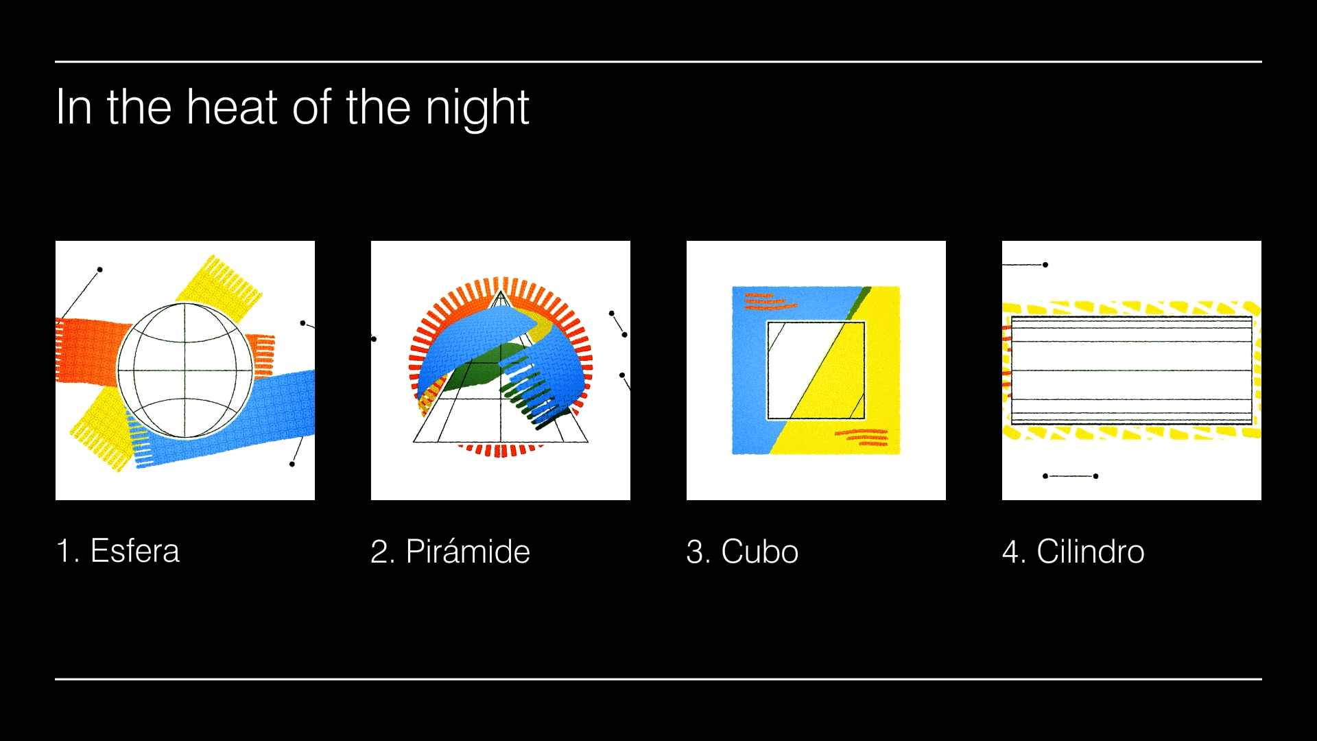Cada animación tiene un cuerpo geométrico específico. Ellos son: la esfera, la pirámide, el cubo y el cilindro.