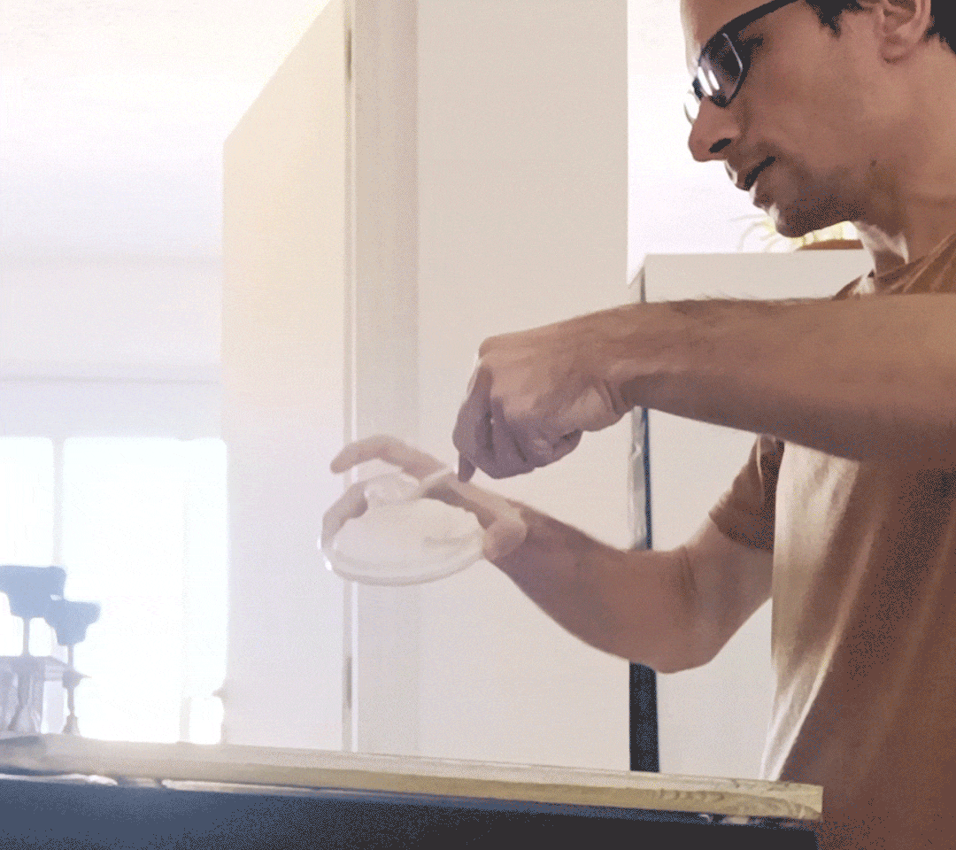 Previamente a hacer el revelado del positivo sobre la pantalla, el shablón fue cubierto con una emulsión fotosensible. Para que la imagen se transfiera del papel vegetal a la pantalla del shablón tuve que hacer una insoladora o caja de revelado con luces LED ultravioleta. Unos breves minutos de exposición y el diseño ya estaba transferido de un soporte a otro.